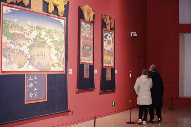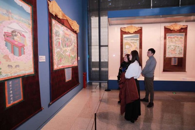 展览开篇以“雪域丹青 千年流韵”为主题,系统梳理了郎卡杰画派的发展历史。画派创始人郎卡杰,被人们尊称为“天空的装饰者”,他的绘画技艺代代传承,从侧面展现了中华文明多元一体的鲜明特征,彰显了中华民族文化的包容性与统一性。