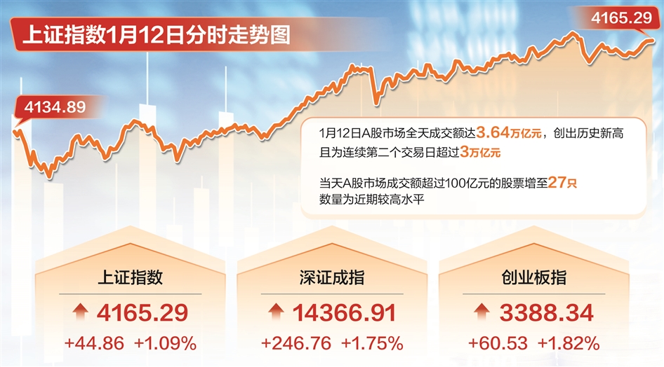 1月12日,A股市场量价齐升,市场延续强势表现,当天上证指数收盘报4165.29点,上涨1.09%,盘中最高至4168.36点。同时,上证指数日K线也收出17连阳。此外,深证成指收涨1.75%,创业板指收涨1.82%。
