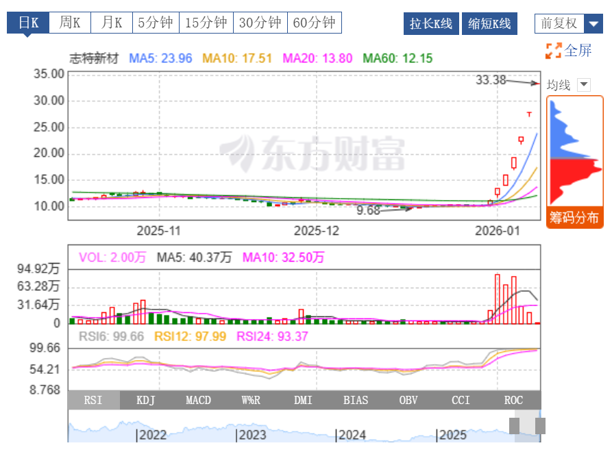 1月12日晚间,江西志特新材料股份有限公司(以下简称“志特新材”)发布公告称,公司股票自2026年1月5日至1月12日连续6个交易日涨停,涨幅为198.57%,股价波动较大。为维护投资者利益,公司将就股票交易波动情况进行核查。经申请,公司股票自1月13日开市起停牌,预计停牌时间不超过3个交易日。公司提醒投资者注意二级市场交易风险。