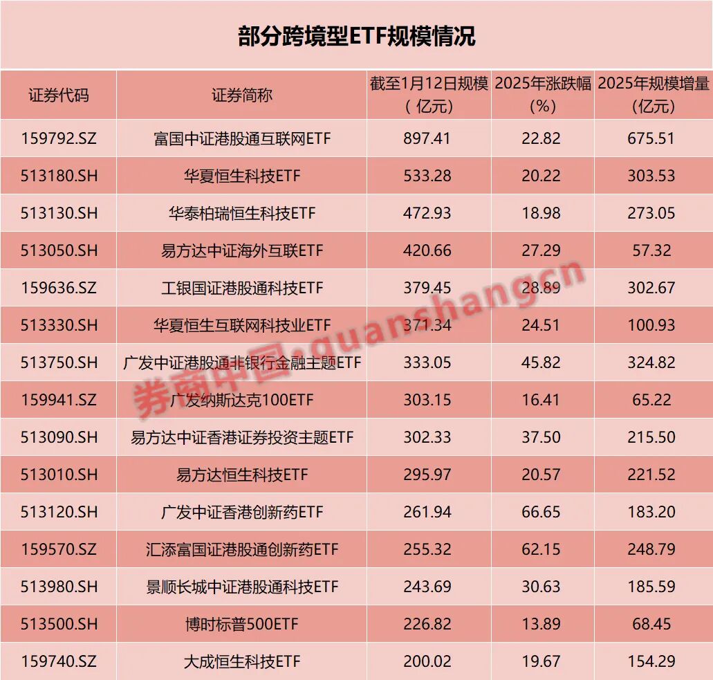 随着全球资本市场共振上涨,资金对海外市场的热情也助推跨境型ETF规模持续攀高。据统计,截至1月13日,跨境型ETF规模总量达到1.0008万亿元人民币,这也是历史上首次突破万亿规模大关。