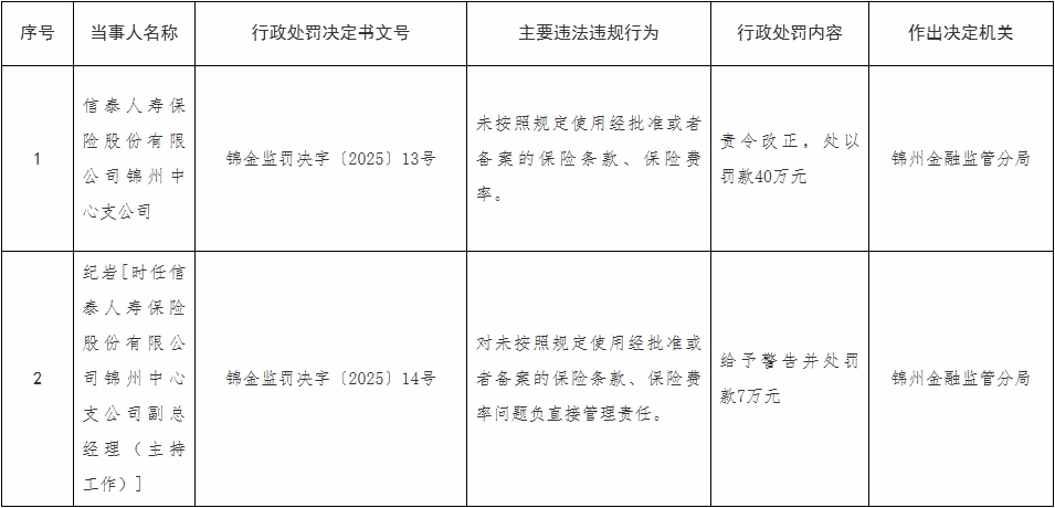 国家金融监督管理总局网站近日公布的锦州金融监管分局行政处罚信息公示列表(锦金监罚决字〔2025〕13号、14号)显示,信泰人寿保险股份有限公司锦州中心支公司未按照规定使用经批准或者备案的保险条款、保险费率。