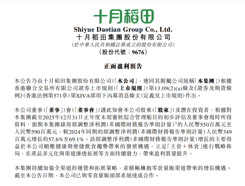 近日,十月稻田集团股份有限公司(以下简称“十月稻田”)发布盈利预告,预计2025年集团经调整净利润约5.5亿元至5.9亿元,同比增长57.6%至69.1%,展现出强劲增长动能。公告称,这得益于公司顺应健康与便捷饮食趋势,立足“主食+休食”战略布局,在产品多元化与渠道拓展上发力。