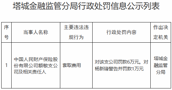 国家金融监督管理总局网站昨日公布的塔城金融监管分局行政处罚信息公示列表显示,中国人民财产保险股份有限公司额敏支公司及相关责任人套取费用。塔城金融监管分局对该支公司罚款6万元;对杨新锋警告并罚款1万元。