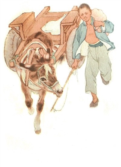 静言思之,此书所以能引发我这番看似“感时”之言,乃缘于其中溢散出来的人与自然、人与人之间的本真气息。而感知显著者,乃是刘继卣的插图。刘继卣出身书画世家,承续乃父工笔画“铁线银钩”的筋骨,又吸纳西洋光影的通透,被评家公推为“当代画圣”和“连环画泰山北斗”。据传,为描摹兽态,他能在动物园枯坐终日,动物们在各种动作下的骨骼形态、肌理变化与位置关系,皆能精准落于笔端,乃至连骡马鬃毛的生长走向、蹄甲的磨损弧度都烂熟于心,故早年间《鸡毛信》里的绵羊、《武松打虎》里的猛虎、《闹天宫》里的猴子、《东郭先生》里的恶狼,都不是符号化的生灵,而是带着体温与呼吸的存在。及至将这种真情落实在《小山子的故事》插图里,便成了小青骡子鼻端的湿润感、石磨盘的粗砺纹、驴车木板的干裂痕。这些细节不是无关紧要的点缀,而是农耕生活可触的真实存在,也正是现代社会最稀缺的质感。而杨啸的文字,也正是这份笔墨的最佳“搭档”,它以孩童视角的质朴笔触,记录下“给骡子梳毛”“帮邻居推磨”的日常,没有华丽辞藻,却用“声音提得高高”“裤脚沾着泥星”这类通俗表达,为插图提供了鲜活的情节背景与心理支撑,让笔墨间的温情有了更具体的情感落点。