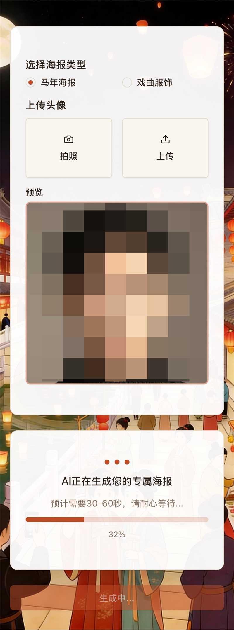 第三步:自拍或者上传肖像照片、填写昵称,点击“生成海报”,因为是专属,是独一无二的设计,AI需要一点计算时间,请耐心等待。