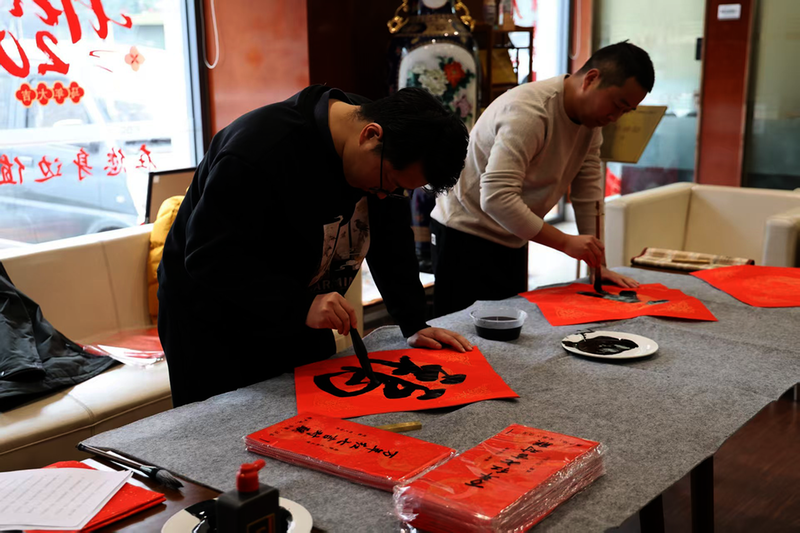 在活动现场,不少年轻客户也加入其中,饶有兴致地围在书法家桌前,请教书法技巧,挑选自己喜欢的春联内容。“90后”小伙王先生是第一次参加这类活动,他选了一副“春风万里山河壮,马到奔腾日月新”的春联,他说:“平时工作忙,很少关注传统节日,这次来银行办业务,偶然遇到这个活动,感觉一下子有了过年的氛围。手写的春联更有仪式感,回去我就贴在门上。”
