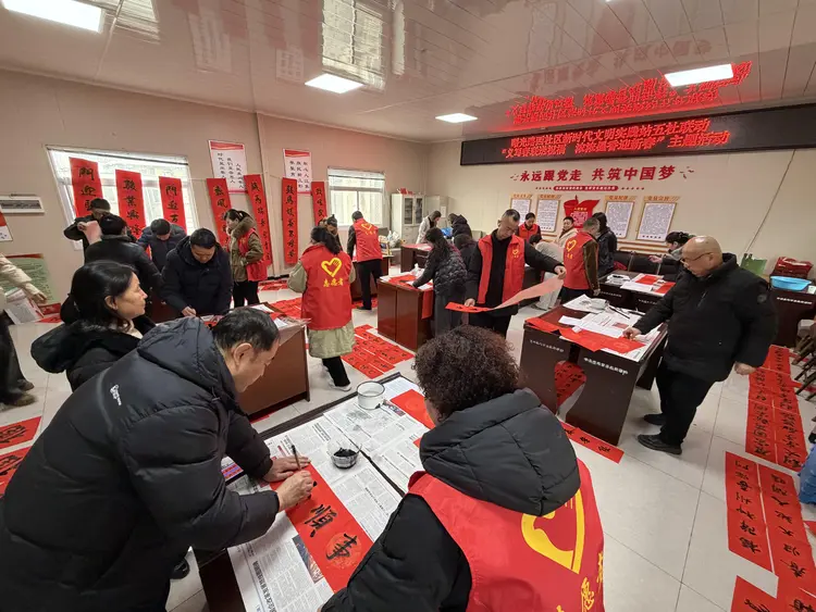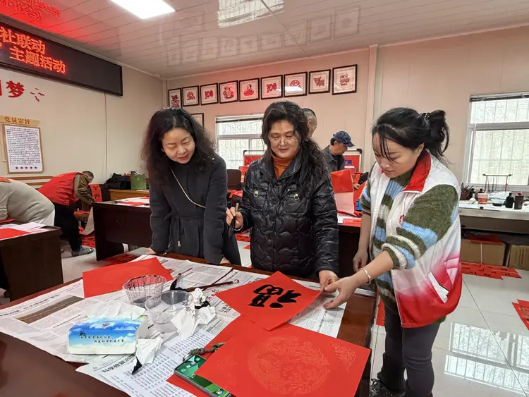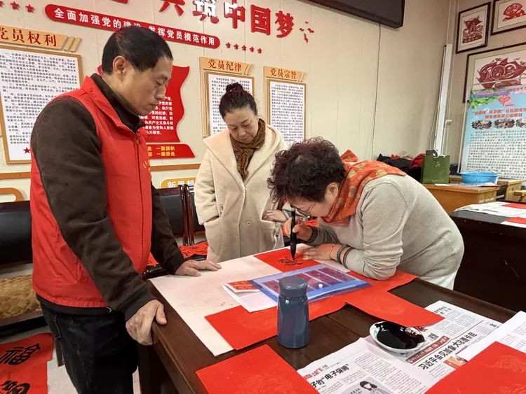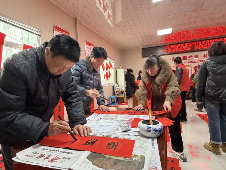 活动现场暖意融融、墨香四溢,书法老师们精神饱满,挥毫泼墨,书体工整端庄、流畅洒脱,一幅幅寓意吉祥的春联、一个个喜庆的“福”字,在红纸上生动呈现。居民们围在一旁,一边欣赏书法创作,一边交流新春期许,拿到墨香未干的春联与福字后,脸上都洋溢着幸福的笑容。