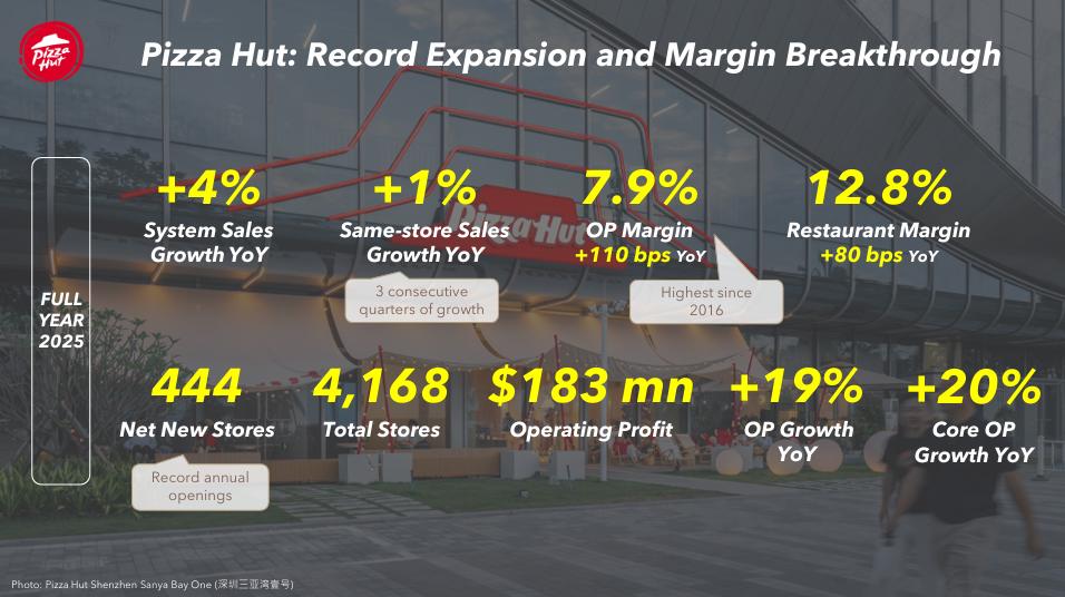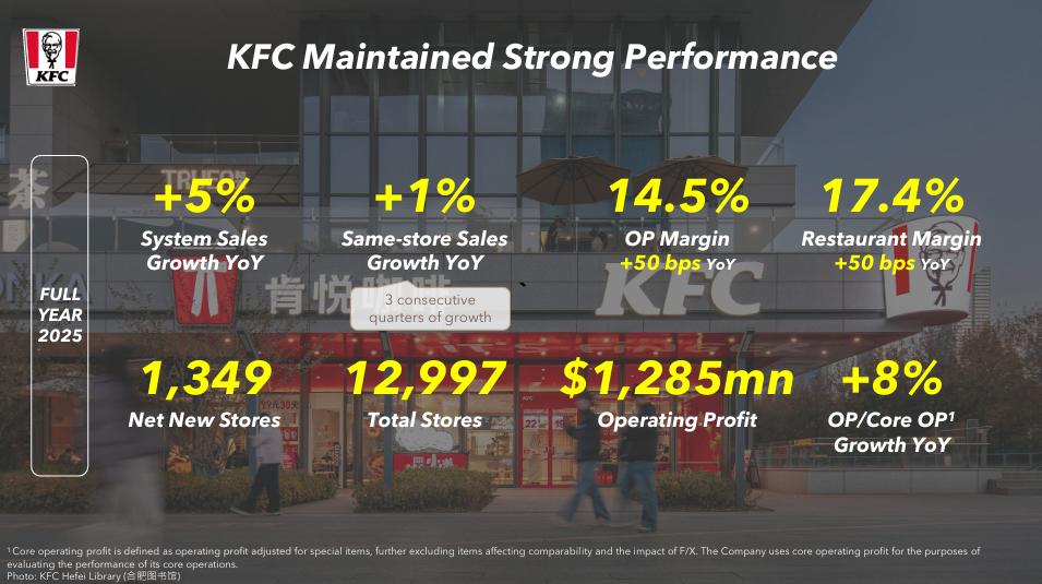 肯德基在2025年全年净新增门店1349家,总规模接近13000家;全年系统销售额、同店销售额分别同比增长5%和1%,营业利润则增长8%至12.9亿美元。