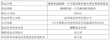 近日,浙商基金公告,浙商科创一个月滚动持有混合、浙商智选先锋一年持有期增聘佘江科。