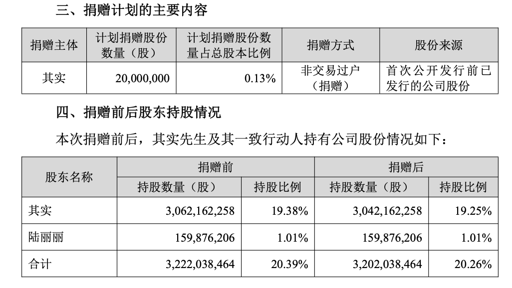 据公告披露,本次捐赠前后,其实及其一致行动人陆丽丽合计持有东方财富股份比例从20.39%降至20.26%。同时,东方财富也明确表示,本次捐赠事项不会导致公司控股股东发生变化,不会对公司治理结构及持续经营产生重大影响。