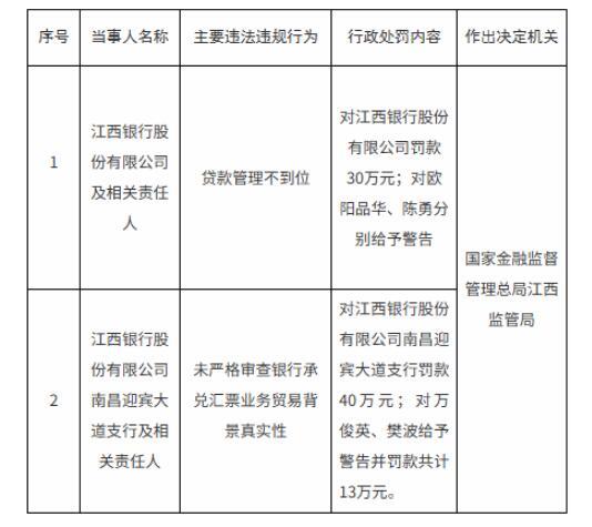其中,因贷款管理不到位,江西银行被罚30万元,相关责任人欧阳品华、陈勇被警告;因未严格审查银行承兑汇票业务贸易背景真实性,江西银行南昌迎宾大道支行被罚40万元,相关责任人万俊英、樊波被警告并罚款共计13万元。