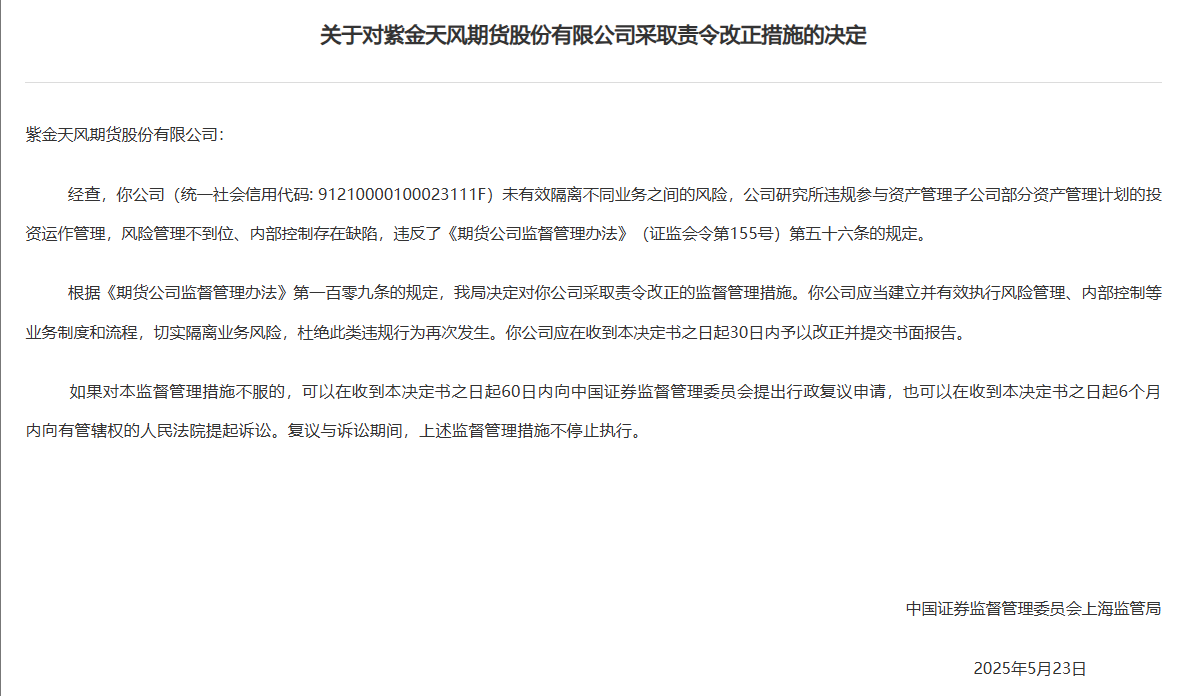 另外注意到,三板挂牌公司紫金天风期货因研究所违规介入资管子公司投资运作,公司及3名高管(包括研究所所长、首席风险官、资产管理和研究所的副总经理)被出具警示函。