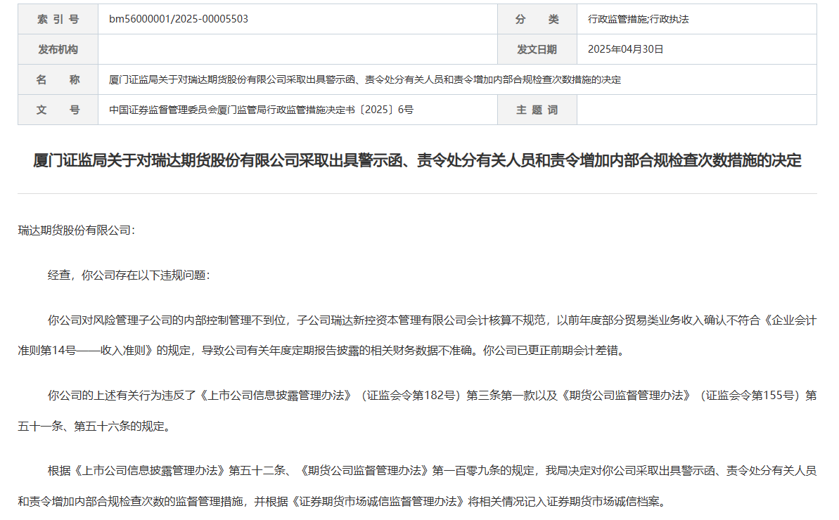 还注意到瑞达期货作为A股上市公司,继去年同期被海南证监局处罚之后,今年4月30日又因内控问题再次被厦门证监局出具警示函。