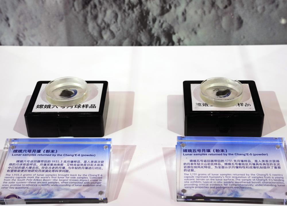 2025年11月5日在第八届进博会国家展中国馆拍摄的嫦娥五号月壤和嫦娥六号月壤。刘颖 摄