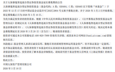近日,中国人保资产管理有限公司发布关于人保睿逸智选混合型证券投资基金延长募集期的公告。