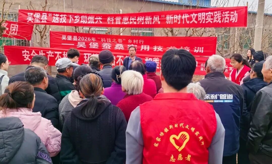 本网讯(通讯员 贺源 刘驰宇 张强)3月17日,榆林市吴堡县2026年“科技之春”乡村行活动走进寇家塬镇,将蚕桑实用技术培训和移风易俗宣讲课堂搬到了田间地头,为蚕农们进行技术“充电”。
