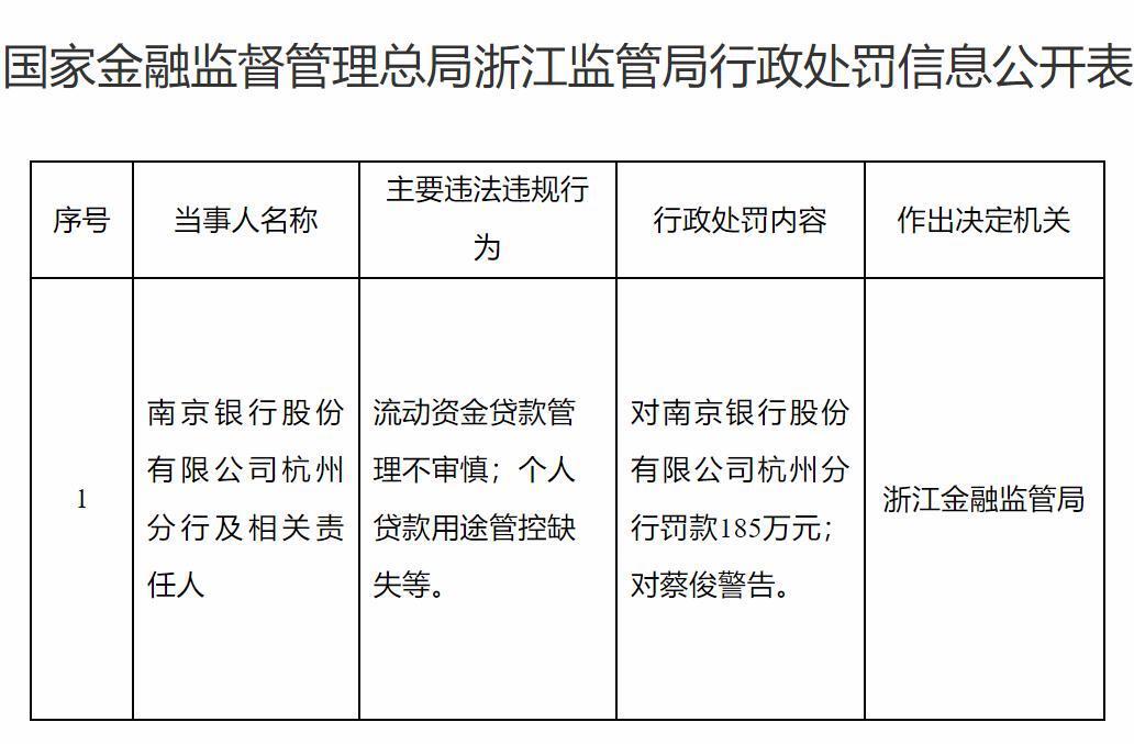3月19日,国家金融监督管理总局浙江监管局(即“浙江金融监管局”)官网显示,南京银行杭州分行因流动资金贷款管理不审慎、个人贷款用途管控缺失等违法违规行为,被罚185万元,相关责任人蔡俊被警告。