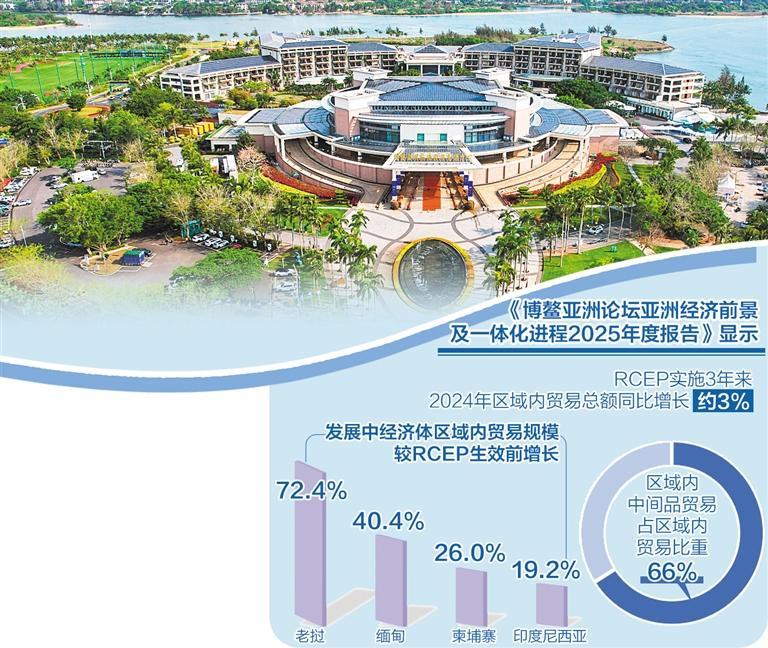 实践证明,博鳌亚洲论坛已成为激活亚太区域合作机制的“催化剂”。《博鳌亚洲论坛亚洲经济前景及一体化进程2025年度报告》显示,RCEP实施3年来,2024年区域内贸易总额同比增长约3%,老挝、缅甸、柬埔寨、印度尼西亚等发展中经济体区域内贸易规模分别较RCEP生效前增长72.4%、40.4%、26.0%和19.2%。区域内中间品贸易占区域内贸易比重达66%,彰显出亚太产业链供应链的韧性与活力。博鳌亚洲论坛通过持续推动RCEP落地细则解读、跨境合作政策协调等工作,有效打通了各国政策梗阻,为中小经济体参与区域分工提供了清晰的政策参考与可行路径。