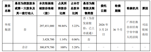 华邦集团本次轮候冻结股份合计30087.97万股,占其所持股份的100%,占兰州银行总股本的5.28%。委托日期为2026年3月25日,轮候期限为36个月,轮候机关为广西壮族自治区南宁市中级人民法院。