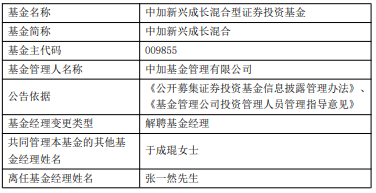 近日,中加基金公告,张一然离任中加新兴成长混合,于成琨管理。