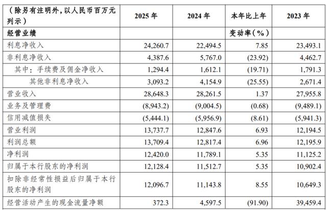 3月25日晚间,重庆农村商业银行股份有限公司(以下简称“渝农商行”)发布的2025年年度报告(以下简称“报告”)显示,该行全年实现营业收入286.48亿元,同比增长1.37%;净利润121.20亿元,同比增长5.35%。但业绩双增“背后”是其净利润增速降至近5年最低,营收总额不及4年前,资产结构中贷款占比不足50%,零售贷款不良率升至2.07%,非利息净收入降近24%……