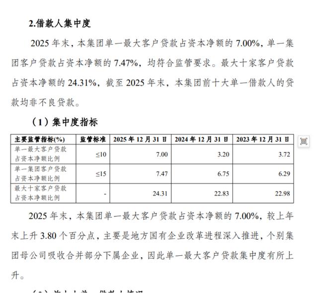 此外渝农商行的单一客户集中度也在上升,2025年末,该行单一最大客户贷款占资本净额的7.00%,较上年末上升3.80个百分点,该指标监管标准为要小于等于10%,目前已经比较接近红线。该行称上升主要是地方国有企业改革进程深入推进,个别集团母公司吸收合并部分下属企业,因此单一最大客户贷款集中度有所上升。