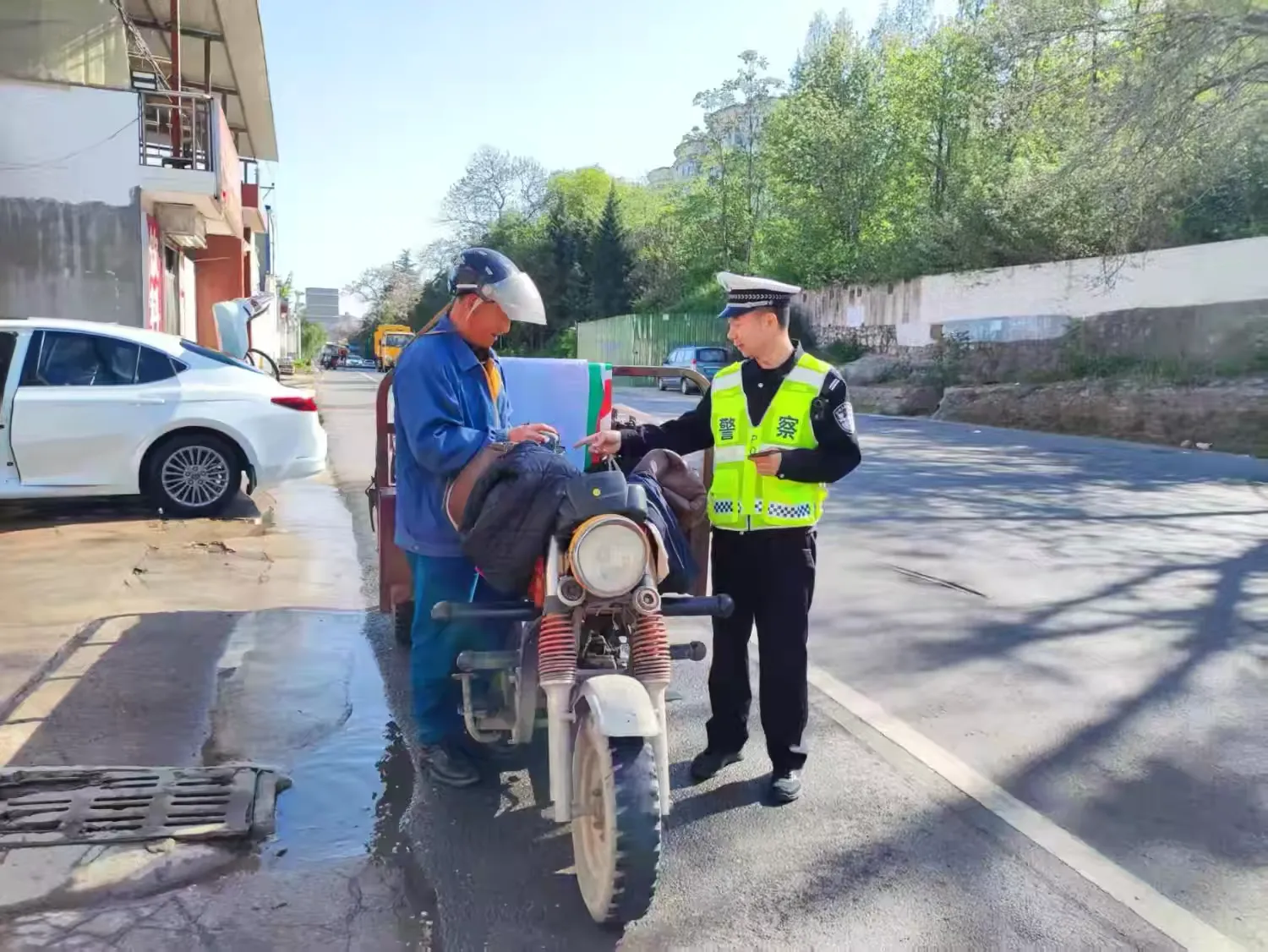 高交大队在辖区沿线村庄,结合春耕特点,重点作了农用车违法载人、超速、不佩戴安全头盔等违法行为主题宣讲活动。